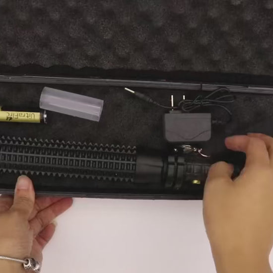 Featuring a rechargeable battery and shock-resistant construction, this flashlight is designed for durability and convenience.