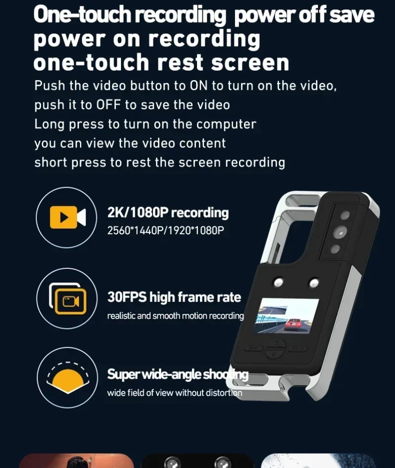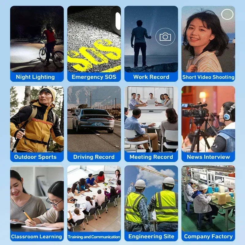 Application scenario:Night Lighting, Emergency SOS, Work Recording, Short Video Shooting, Outdoor SportsCar RecordingMeeting records, news interviews,classroom learning,training exchanges.engineering sites, company factories, hanging button shooting