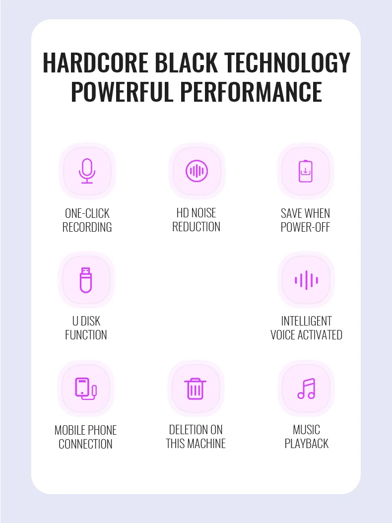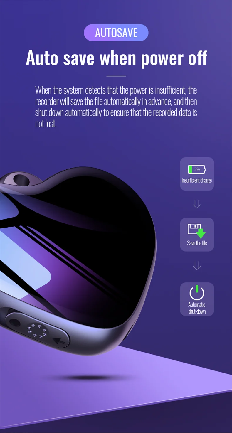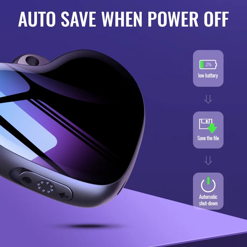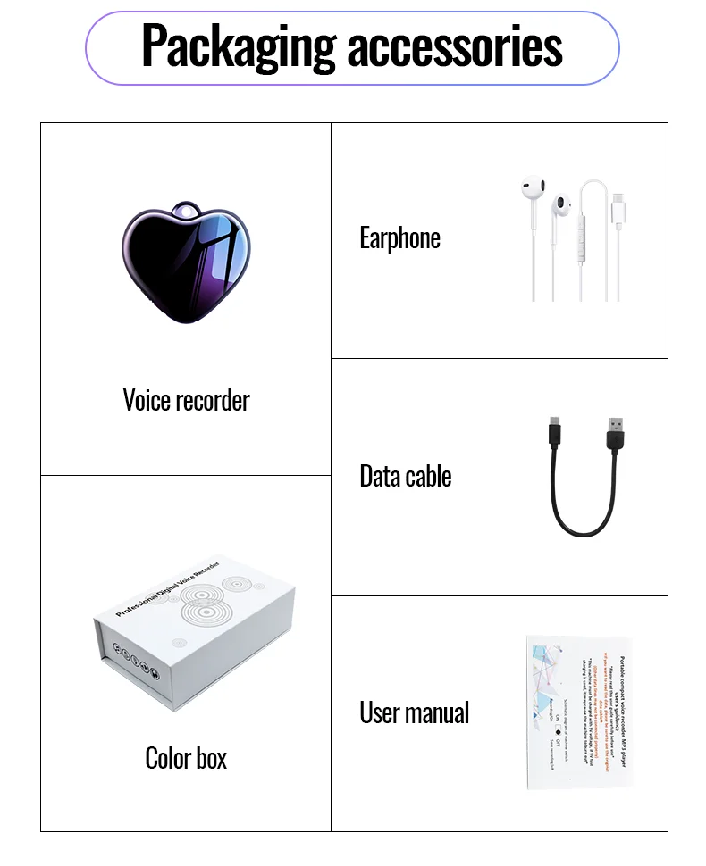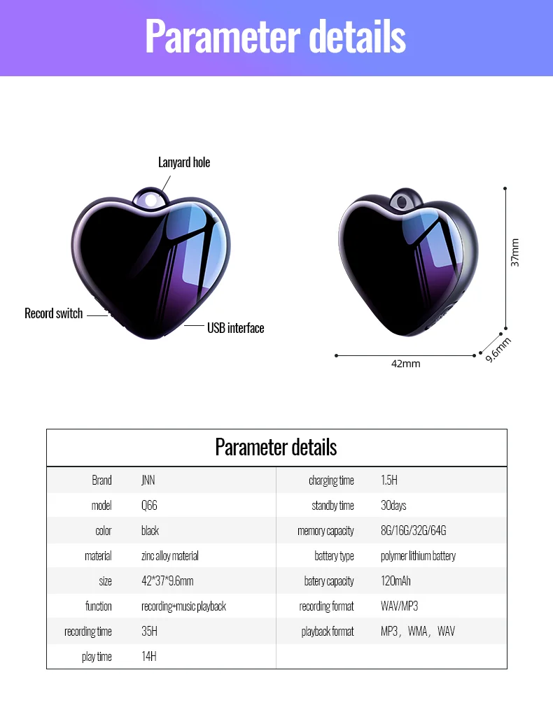 Features: 1.Elegant Jewelry: This mini voice recorder doubles as a stunning heart-shaped pendant, offering not only digital recording device functionality but also serves as a beautiful and elegant piece of jewelry when not in use. 2.One-Touch Recording: Thoughtfully designed with one-touch recording, this voice activated recorder allows you to effortlessly start recording at any moment by simply pressing the recording button, capturing important moments with ease. 3.Smart Voice Activation: Featuring intelligent voice activation technology, the small audio player starts recording when it detects sound and stops in silence, efficiently conserving memory space and battery life while capturing every sound detail. 4.Scheduled Recording: With the versatile scheduled recording feature, you can set up recordings anytime, anywhere, making your micro recording pendant more professional in timing, ensuring you never miss a moment worth recording. 5.Auto-Save Function: Ensures peace of mind with automatic file saving; when low power is detected, the digital recording device system saves recordings and powers down, guaranteeing that valuable audio data is never lost. Specification: Origin: Mainland China Color: Black Material: Aluminum Alloy Battery Capacity: 120mAh Charging Time: 1.5H Standby Time: 30 Days Quick Recording: One-button Two-speed / One-button Normal Recording, (One-button Voice Control Recording can be set) Voice Control Recording: Support (Voice Control Sensitivity is adjustable) Recording Format: WAV Playback Format: MP3, WMA, OGG, APE, FLAC, WAV, AAC-LC ACELP Timestamp: With timestamp Other Functions: With delete function, power LED indicator, playback LED indicator, automatic split recording, circle overwrite recording, support fast forward and rewind playback, adjustable bit rate 192-1536kbit, timed recording, wired control operation ,5D glass, beautiful appearance, with lanyard hole Product size: 42x37x9.6mm/1.65x1.46x0.38inch Product weight: 24g Packaging size: 146x90x44mm/5.69x3.51x1.72in Gross weight: 137g Note: |