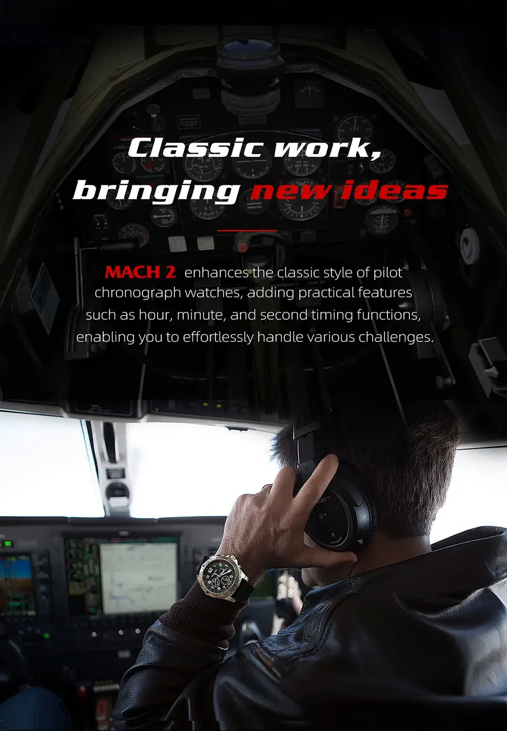 MACH 2 enhances the classic style of pilot chronograph watches, adding practical features such as hour, minute, and second timing functions, enabling you to effortlessly handle various challenges.
