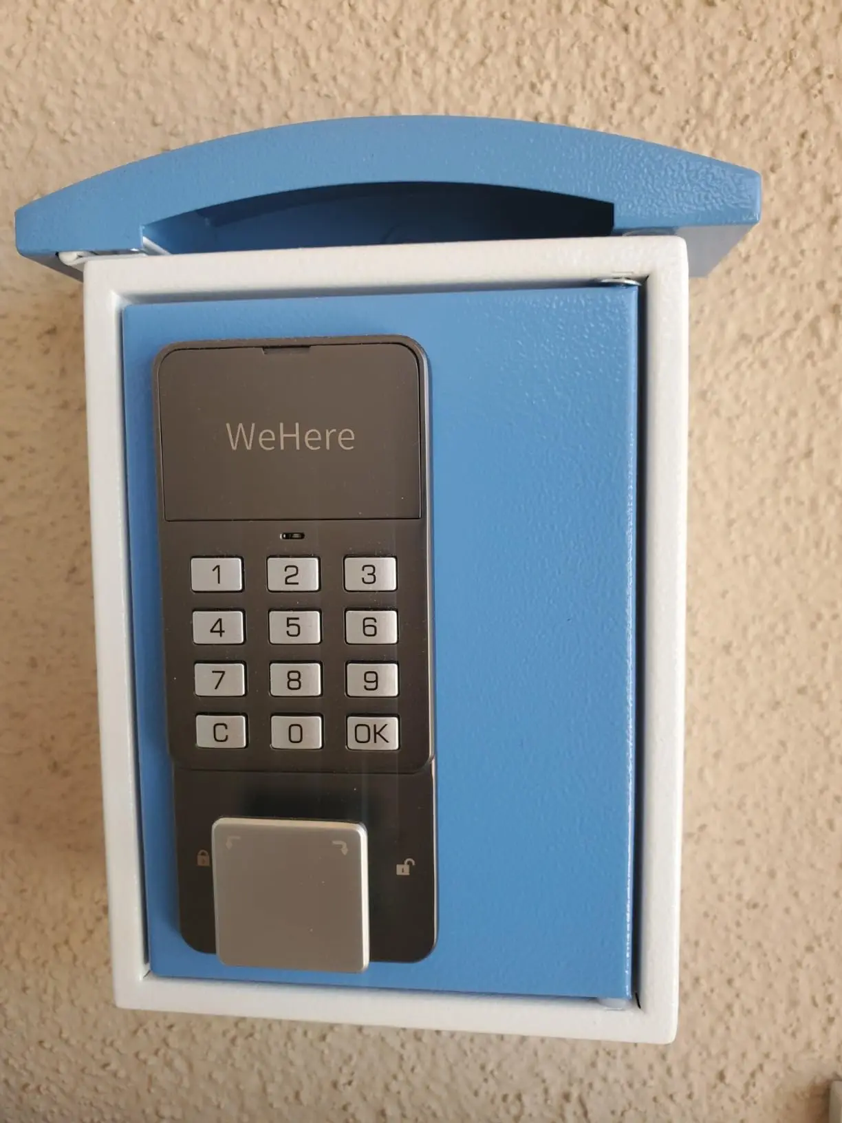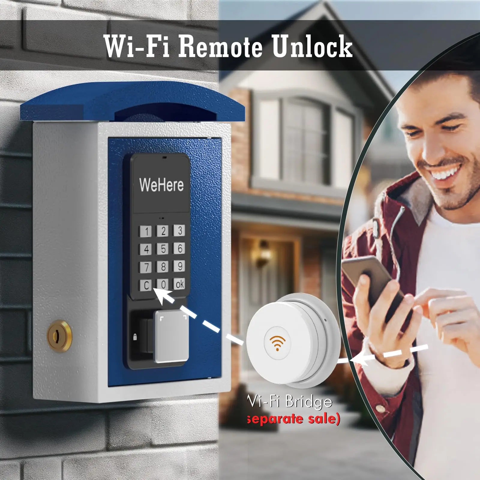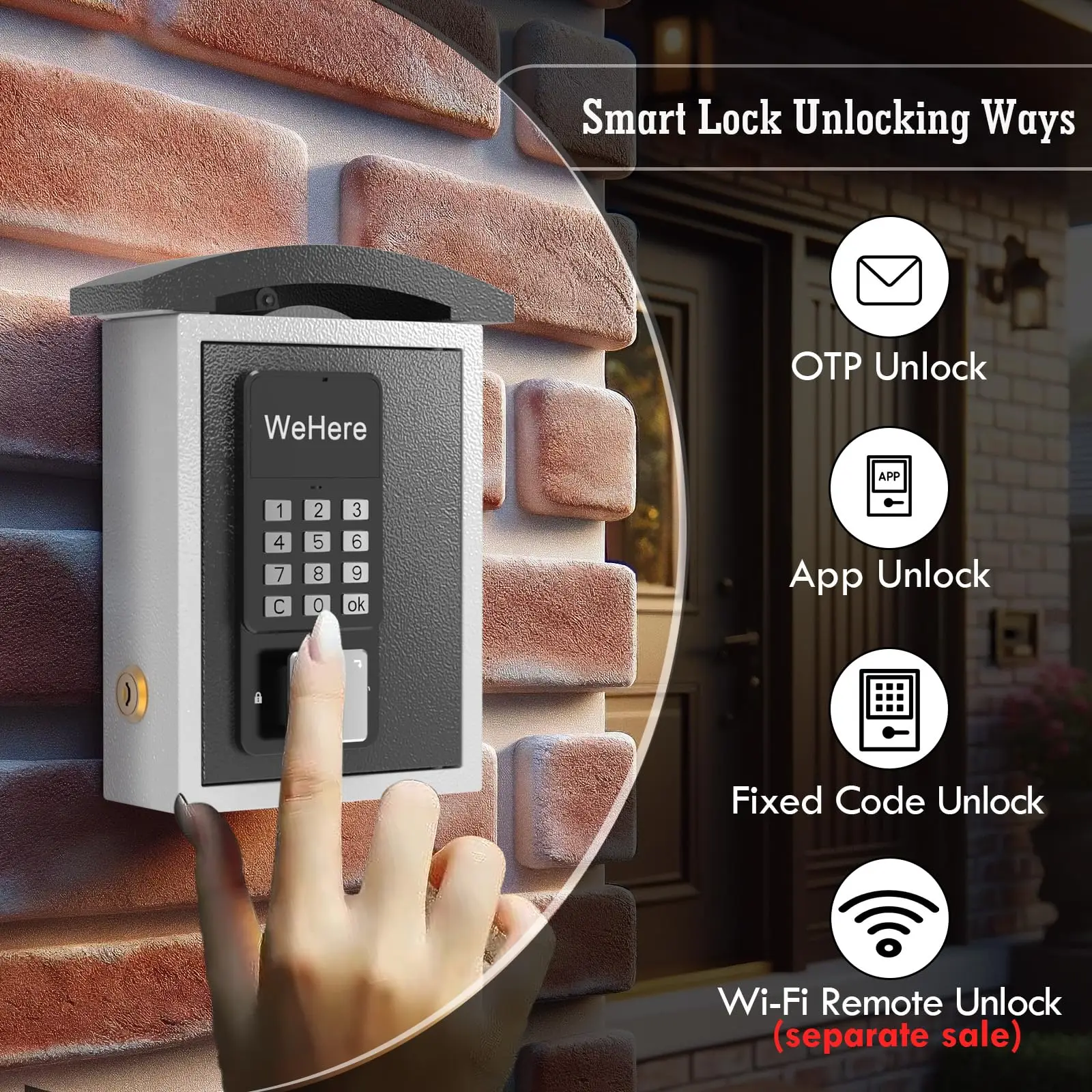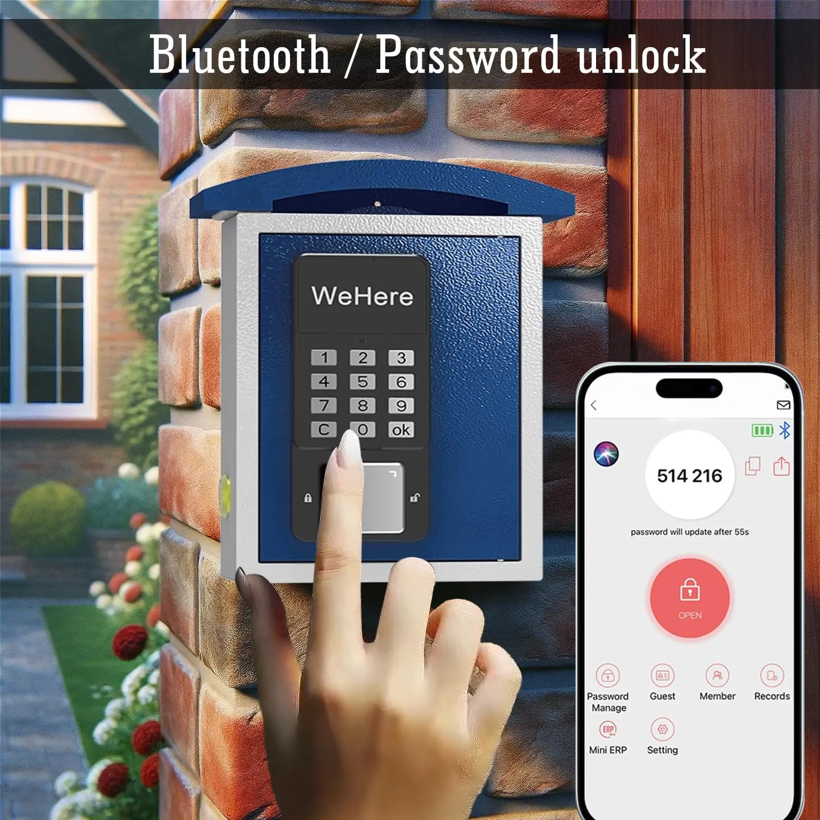 [4 ways to unlock] 1,Password unlocking, which includes one-time passwords and fixed passwords. You can set a validity period for the password. After setting a validity period for a one-time password, you can generate a URL for the password, which can be shared with clients via social media. 2, Bluetooth unlocking, which requires the installation of the WeHere App to use. 3, Wi-Fi remote unlocking,The WiFi bridge needs to be purchased separately. 4,Backup key unlocking.