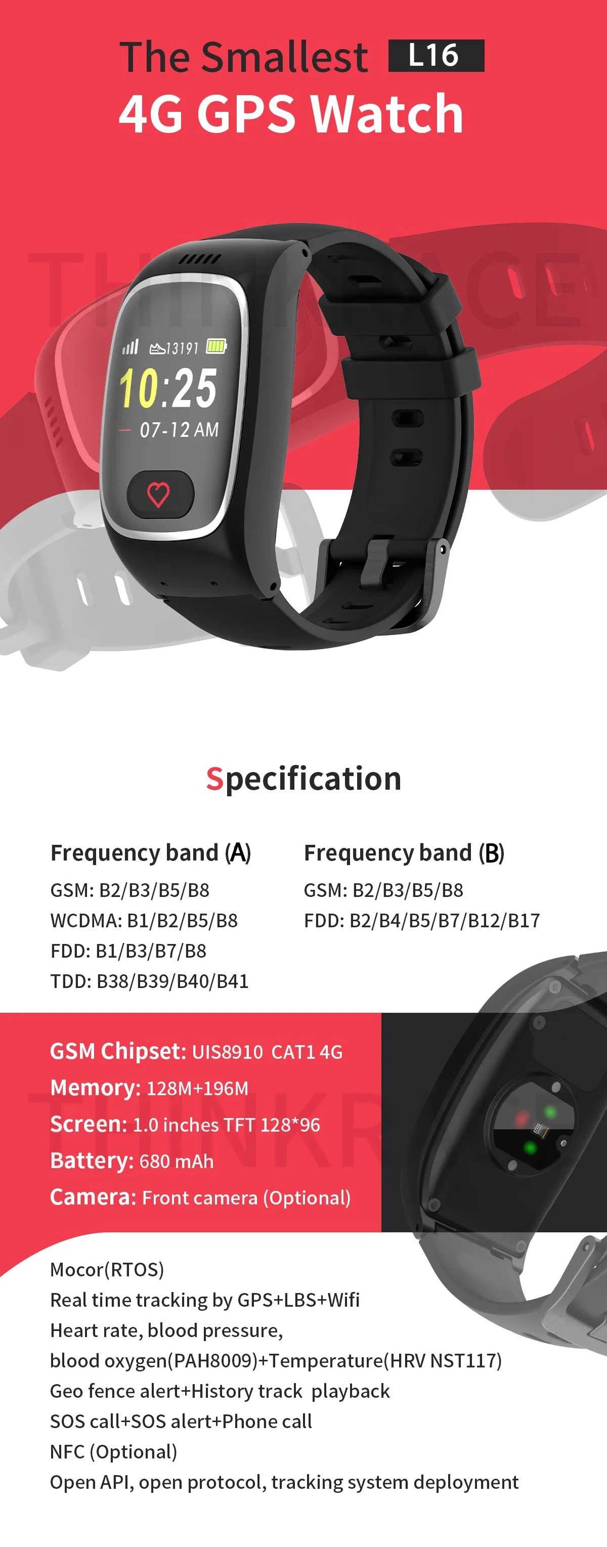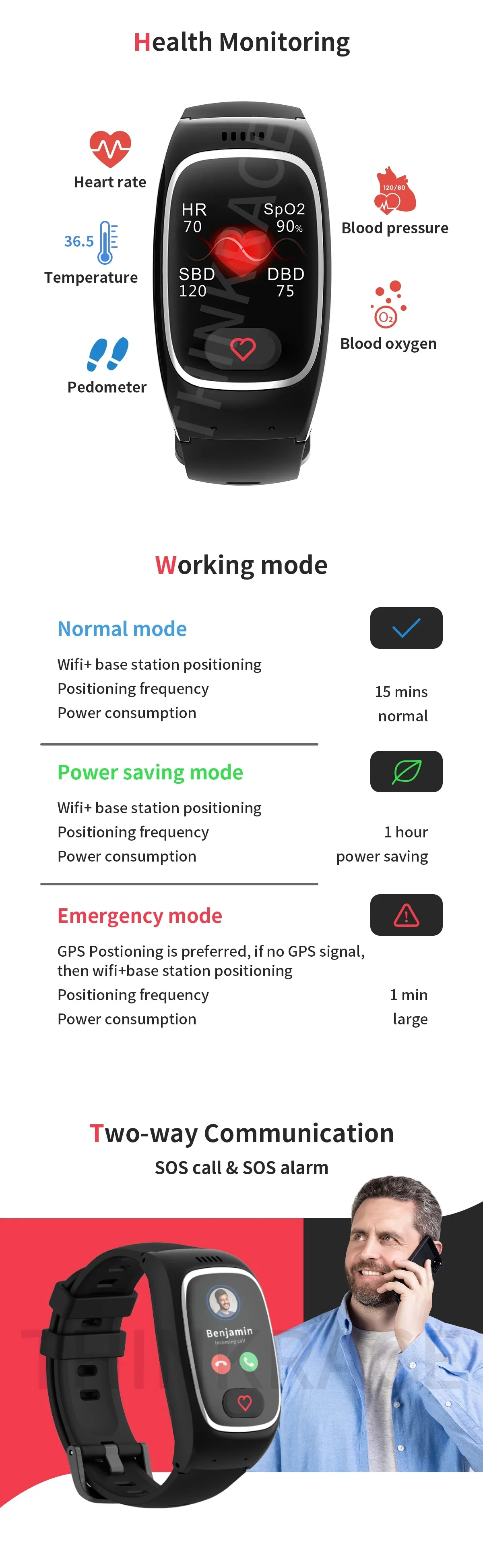 Communication: SOS, 2-way phone call, Voice & Text message, Remote monitor;
