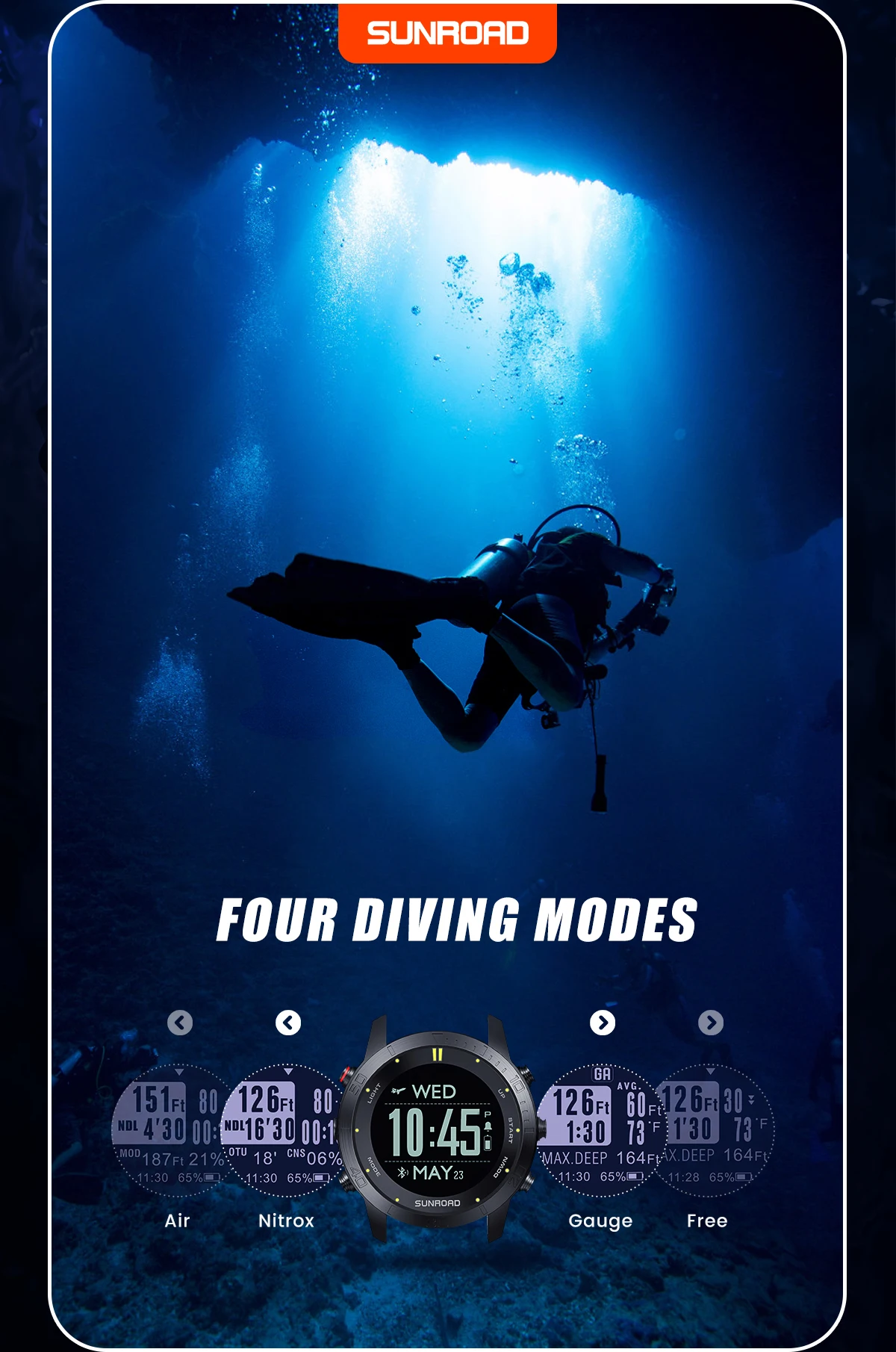3. Diving mode: Air mode, Nitrox mode, Gauge diving, free diving,
