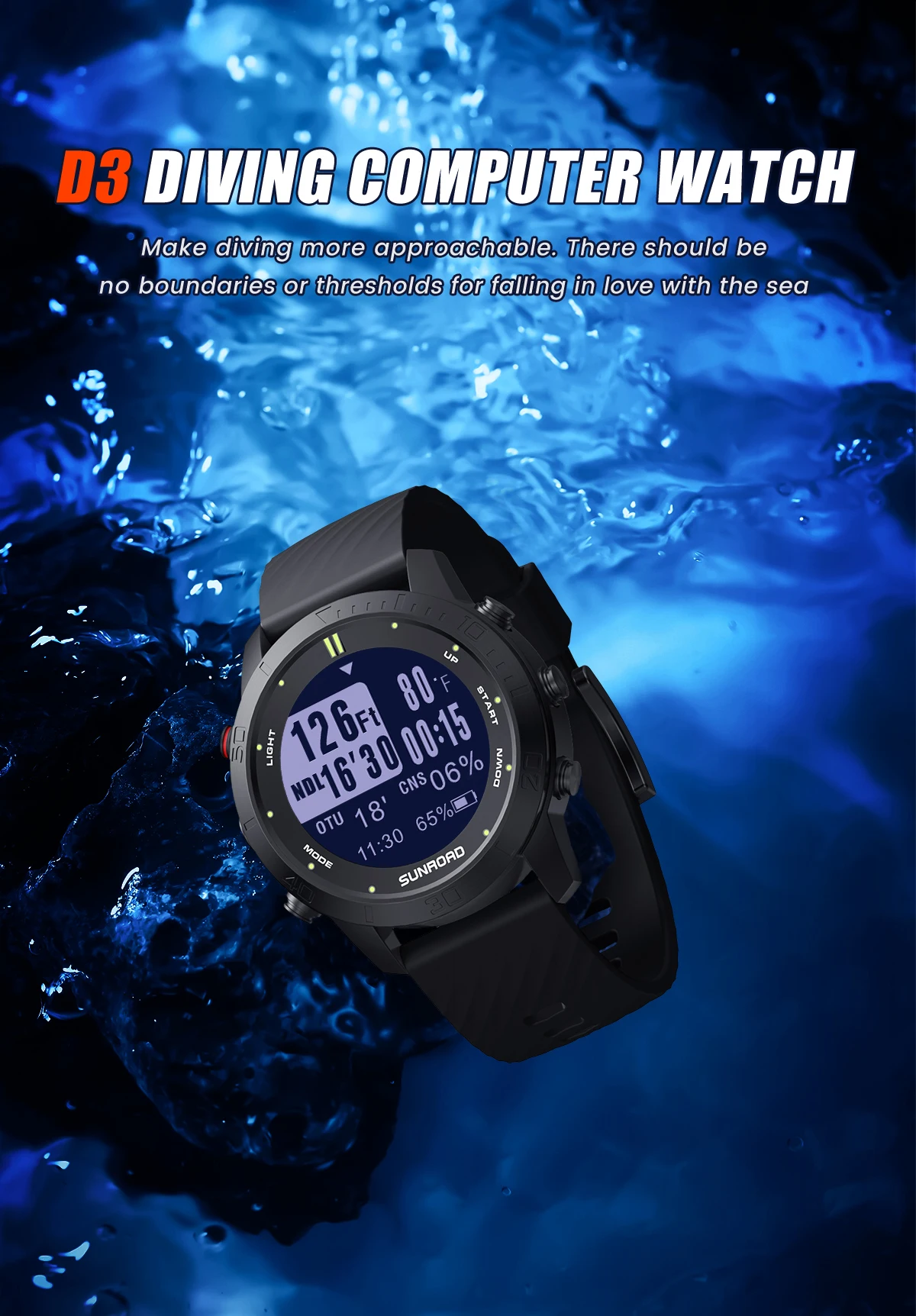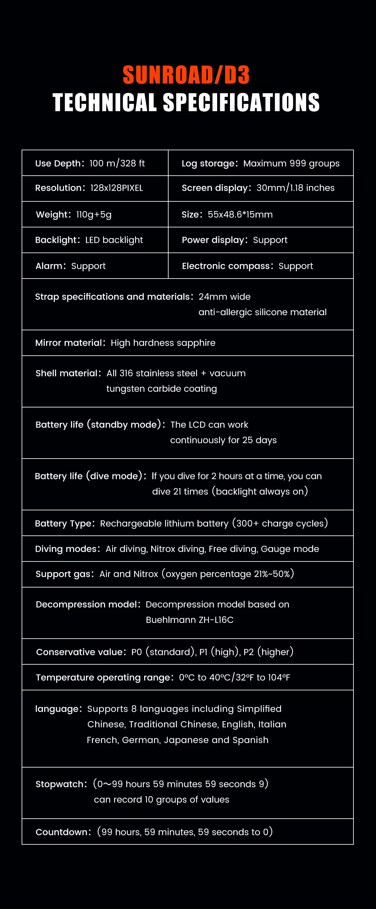 Sunroad D3 Professional Diving Computer Watch Free Scuba 100m Depth Waterproof Safety Alarm Men Woman Digital Wristwatch