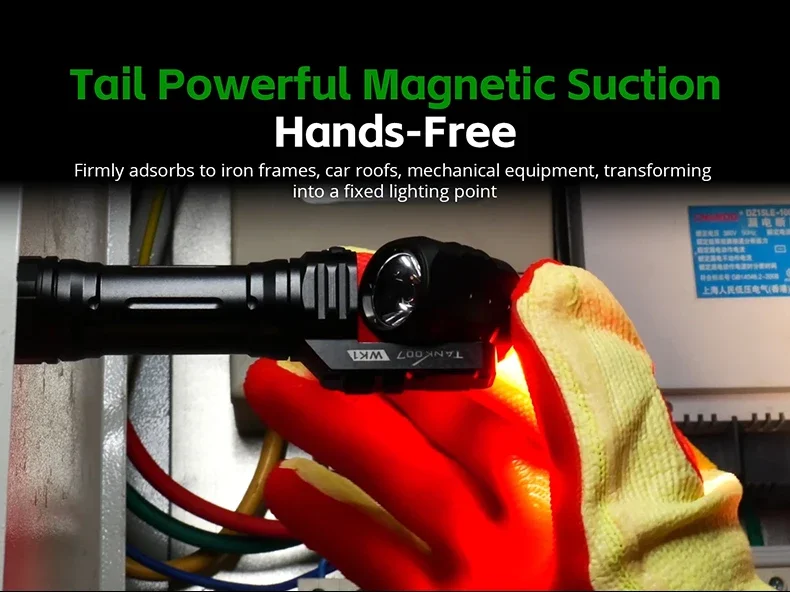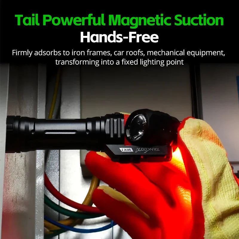 This innovative two-way magnetic flashlight features a dual-directional light source and a rotatable lamp head, delivering both focused long-range illumination from the front and wide-angle floodlighting from the rear. Its powerful magnetic base securely attaches to metal surfaces, keeping your hands free for repairs, camping, or emergency tasks.