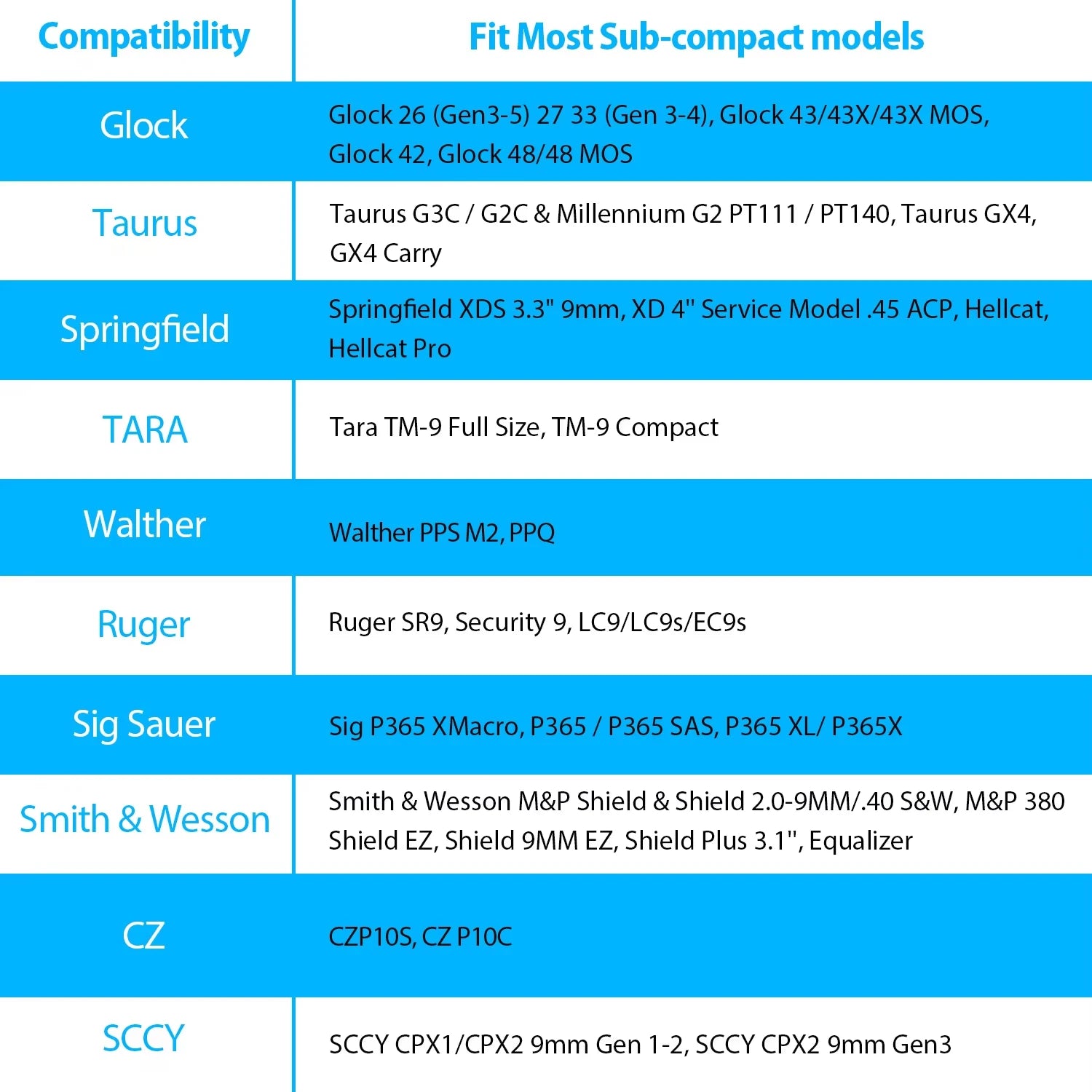 【Fit Most Sub-Compact Pistols】 Compatible with Glock 43X MOS G43X G43 G48MOS G48 Glock 26 27 33/// Sig P365 XMacro, P365XL, P365/// SCCY CPX2 Gen3, CPX2 Gen2/// Taurus G3C, G2C, G2 PT111, GX4/// Springfield Hellcat Pro, Hellcat, XD-S, Ruger SR9, Security 9, LC9/// S&W Shield EZ, Equalizer, Shield, Shield Plus/// CZ P10S P10C/// TARA TM-9 Full Size&Compact.
